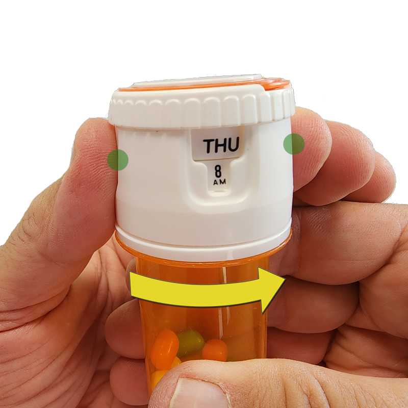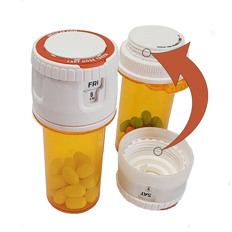 This reusable medication timing cap attaches effortlessly to each of the patients' existing 1-Clic® vial caps, allowing patients to store their prescription medications securely in their original container to ensure they adhere to their prescribed medication schedules. Meticap records day of week and hours, as well as "Last Dose Taken" or "Next Dose". Keeping the medication with the original label is critical - something seven-day pill organizers cannot do. The affordability of Meticap means that patients have the ability to purchase a Meticap for each medication and re-use Meticaps indefinitely for refills.