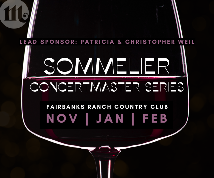 SAN DIEGO, CA, October 14, 2024 /24-7PressRelease/ -- Mainly Mozart – the San Diego nonprofit behind the highly acclaimed, annual Mainly Mozart All-Star Orchestra Festival – has announced an exciting new chamber music series, Sommelier Series: The Concertmasters, launching Fall 2024. Three intimate concerts, Nov. 16, Jan 11 and Feb 8, will take place at Fairbanks Ranch Country Club and feature concertmasters from the Philadelphia Orchestra, Dallas Symphony and Los Angeles Philharmonic, paired with top sommeliers who have chosen wines inspired by each concert's program. Tickets are on sale now for all three concerts in the series at www.mainlymozart.org/wine.