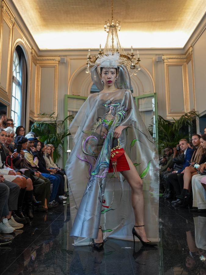 This year, the fusion of art and fashion took center stage, with award-winning American artist and designer Bella Yanbo Huang debuting her latest collection, "Blossom Time." Huang's work, known for its blend of fine art and fashion, made a striking impression with hand-painted silk shawls, scarves, and handbags that merged wearable art with high fashion.