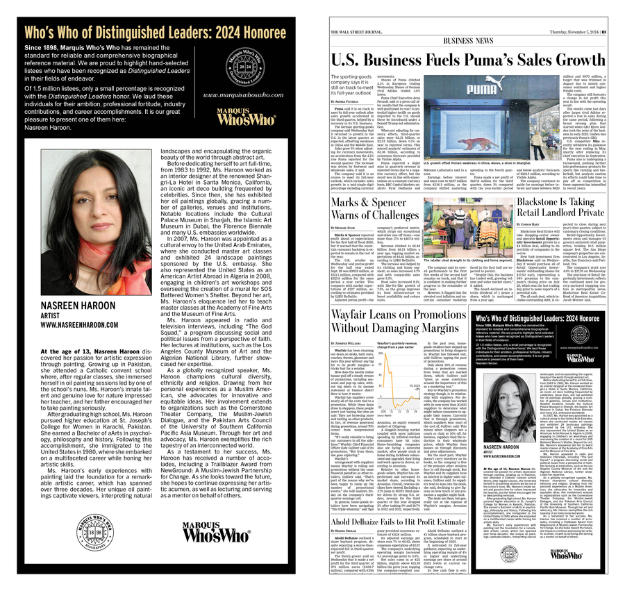 LOS ANGELES, CA, November 12, 2024 /24-7PressRelease/ -- Nasreen Haroon was selected by Marquis Who's Who for a prominent feature in the Southern California Edition of The Wall Street Journal, published on November 7, 2024.