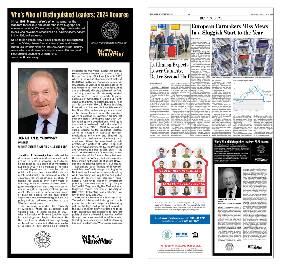 WASHINGTON, November 12, 2024 /24-7PressRelease/ -- Jonathan R. Yarowsky, partner of Wilmer Cutler Pickering Hale and Dorr, was selected by Marquis Who's Who for a prominent feature in the Southern California Edition of The Wall Street Journal, published on May 1, 2024.