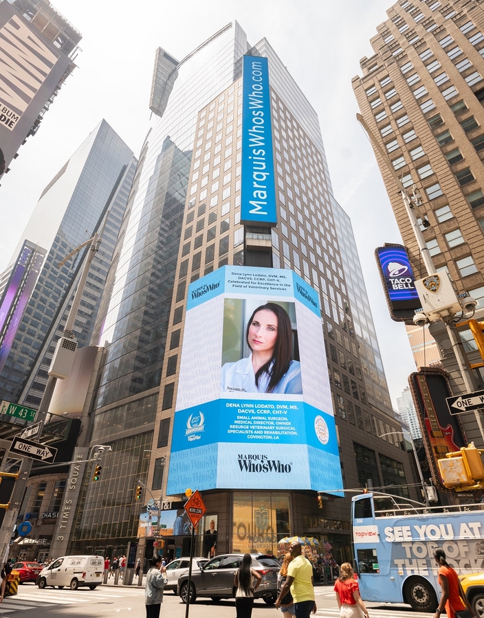 COVINGTON, LA, November 15, 2024 /24-7PressRelease/ -- Dena Lynn Lodato, DVM, MS, DACVS, CCRP, CHT-V, is a distinguished biographee of Marquis Who's Who. She was recently spotlighted in New York City's Times Square on a 22-story screen that is passed by an estimated 1.5 million people daily. As in all Marquis Who's Who biographical volumes, individuals profiled are chosen from among a pool of the most prominent professionals and are selected on the basis of current reference value. Factors such as position, noteworthy accomplishments, visibility, and prominence in a field are all taken into account during the selection process.