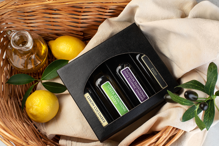 Discover the perfect culinary gift featuring four delightful 60 ml bottles that will elevate any kitchen. This exquisite collection includes: Extra Virgin Olive Oil, Dark Balsamic Vinegar, Greek Seasoning EVOO and Lemon Cucumber White Balsamic Vinegar: Refreshingly unique, our lemon cucumber white balsamic vinegar combines zesty citrus with a hint of cool cucumber. It's perfect for brightening salads, seafood, or as a finishing touch to grilled vegetables.
