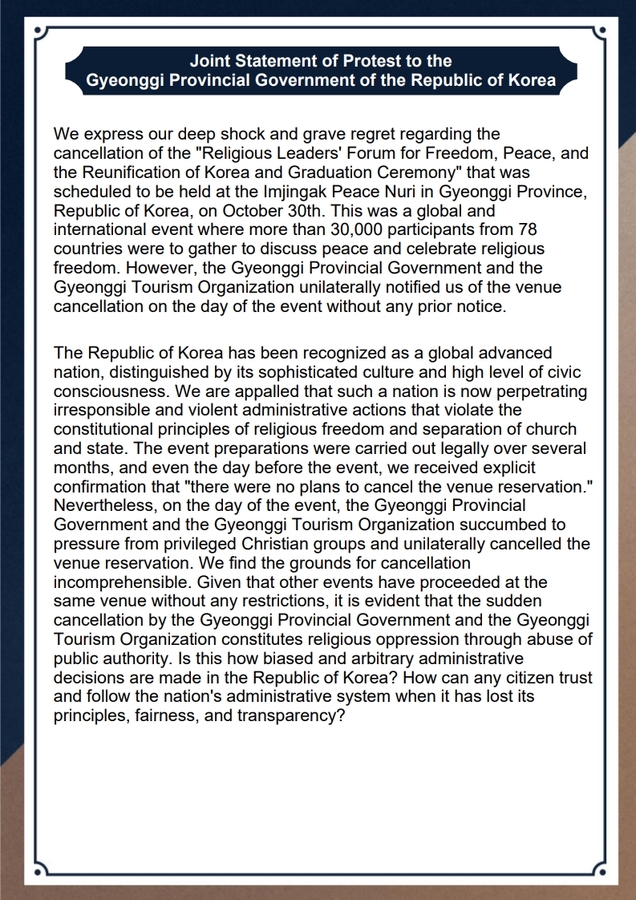 However, the Gyeonggi Tourism Organization (GTO), a public entity under Gyeonggi Province, abruptly canceled the venue rental at 11pm on the morning of the event, when preparations were already underway. This decision, made without prior notice, has resulted in significant financial damage to the international event and its organizers. As the first clause of Article 20 of the South Korean Constitution states: "All citizens shall enjoy freedom of religion.", they argue that the cancellation constitutes an unconstitutional act of discrimination against a specific religion, violating religious freedom, human rights, and due process of law and an act that divides the people and divides the country into two.