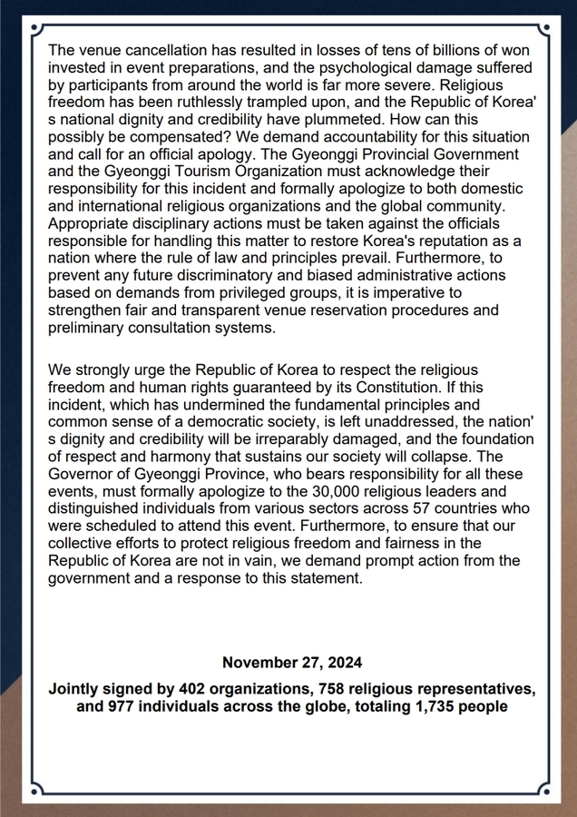 PAJU, KOREA, December 07, 2024 /24-7PressRelease/ -- An administrative decision by a South Korean government agency sparked international controversy, raising concerns about religious freedom. On November 27, religious leaders and opinion leaders delivered a joint protest statement to the Government of the Republic of Korea condemning the cancellation of the venue rental on October 29th as an act of biased religious oppression through public power. Signed by 402 organizations, 758 religious representatives, and 977 individuals across the globe, totaling 1,735 signatories, the statement emphasized the psychological and financial damage caused to the international participants and highlighted the need for accountability.
