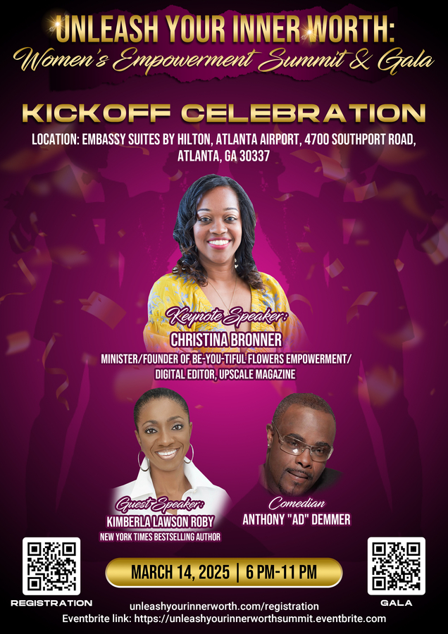 The two-day event will kick off on March 14, 2025, with a powerful keynote address by Christina Bronner, minister, founder of Be-You-Tiful Flowers Empowerment. Guests will also enjoy an intimate discussion and book signing with Kimberla Lawson Roby, the New York Times bestselling author who has sold over one million books worldwide. The evening will conclude with laughter, courtesy of comedian Anthony "AD" Demmer, in a comedy show that's sure to entertain.