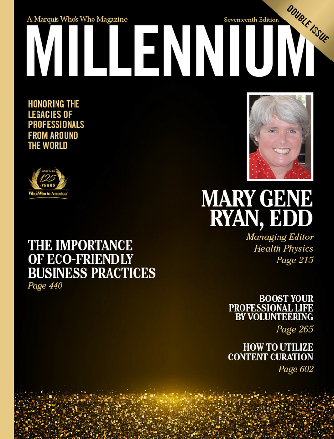 SHREWSBURY, MA, December 20, 2024 /24-7PressRelease/ -- Mary Gene Ryan, EdD, managing editor at Health Physics, has been selected for a cover feature in the Seventeenth Edition of Marquis Millennium Magazine. Released triannually, Millennium Magazine features the narrative biographies of the world's most esteemed and accomplished professionals. The publication is available exclusively to Marquis listees, and inclusion is by invitation only.