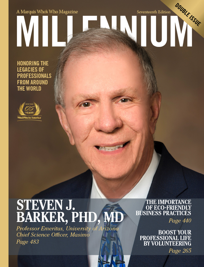 TUCSON, AZ, January 09, 2025 /24-7PressRelease/ -- Steven J. Barker, PhD, MD, professor emeritus at the University of Arizona and chief science officer at Masimo Corporation, has been selected for a cover feature in the Seventeenth Edition of Marquis Millennium Magazine. Released triannually, Millennium Magazine features the narrative biographies of the world's most esteemed and accomplished professionals. The publication is available exclusively to Marquis listees, and inclusion is by invitation only.