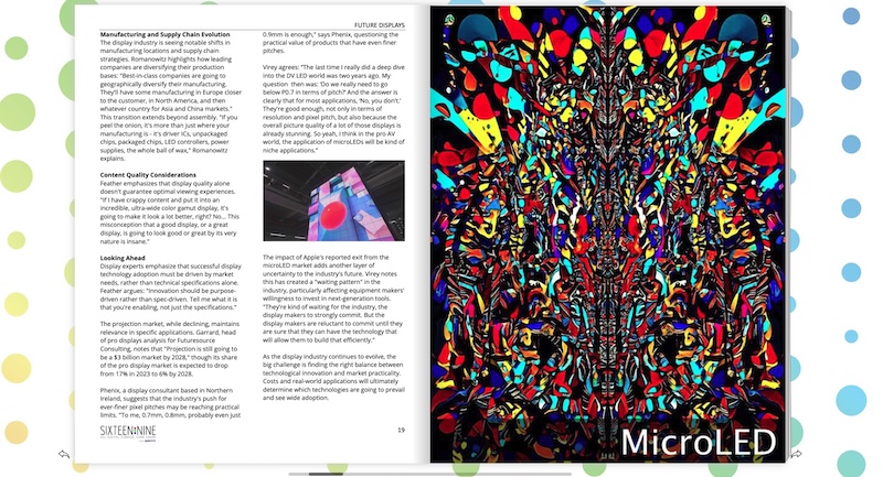 Future Displays is sorted by topics and interest areas, including microLED, conventional LED, OLED, LCD, visual illusions, media architecture and the fast-rising topic of sustainable display tech. It also explores under-appreciated areas such as display infrastructure and interactive technologies.