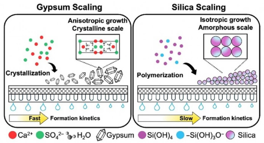 Mineral scaling, a significant issue in membrane desalination, reduces water recovery rates and diminishes system performance. Gypsum and silica, are two prevalent types of scaling, each form through different processes—crystallization for gypsum and polymerization for silica. These formation mechanisms lead to contrasting behaviors: gypsum scaling, marked by rapid kinetics and intrusive crystal growth, causes pore wetting, while silica scaling forms highly adhesive, irreversible layers. The impact of these scales on desalination efficiency underscores the need for a deeper understanding of their formation and mitigation.