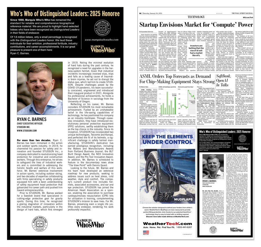 SHERWOOD, OR, January 31, 2025 /24-7PressRelease/ -- Ryan C. Barnes, chief executive officer of STUDSON Inc., was selected by Marquis Who's Who for a prominent feature in the Pacific Northwest Edition of The Wall Street Journal, published on January 30, 2025.