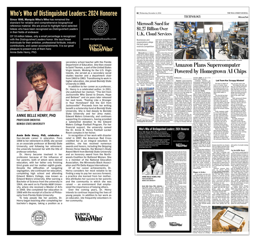 JACKSONVILLE, FL, February 03, 2025 /24-7PressRelease/ -- Annie Belle Henry, PhD, professor emeritus of Bemidji State University, was selected by Marquis Who's Who for a prominent feature in the Florida Edition of The Wall Street Journal, published on December 4, 2024.