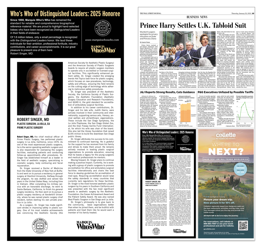 LA JOLLA, CA, February 03, 2025 /24-7PressRelease/ -- Robert Singer, MD, plastic surgeon with Prime Plastic Surgery, La Jolla, was selected by Marquis Who's Who for a prominent feature in the Southern California Edition of The Wall Street Journal, published on January 23, 2025.