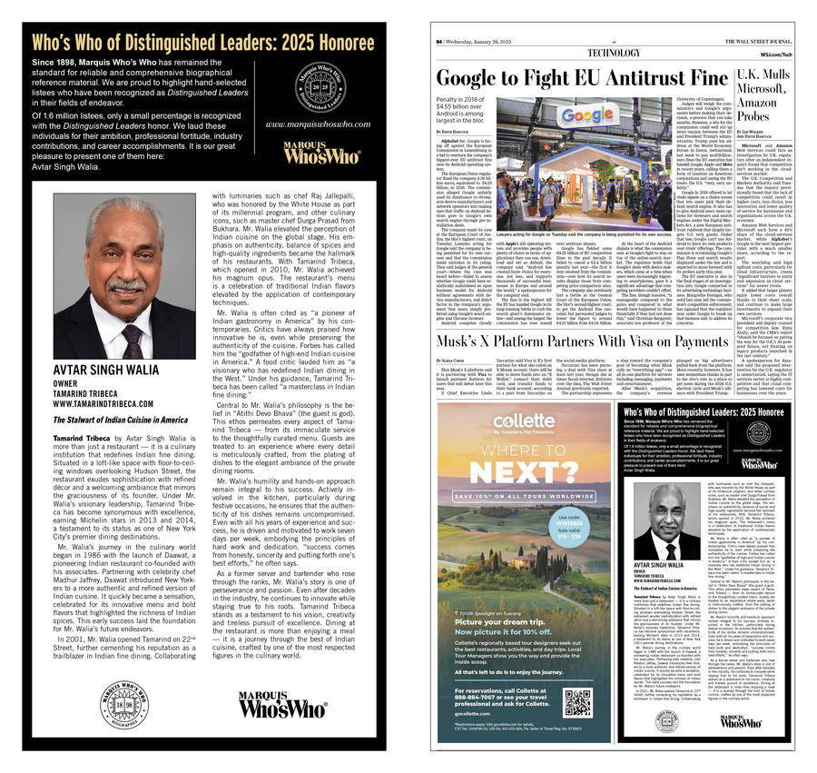 NEW YORK, February 03, 2025 /24-7PressRelease/ -- Avtar Singh Walia, owner of Tamarind Tribeca, was selected by Marquis Who's Who for a prominent feature in the New York Edition of The Wall Street Journal, published on January 29, 2025.