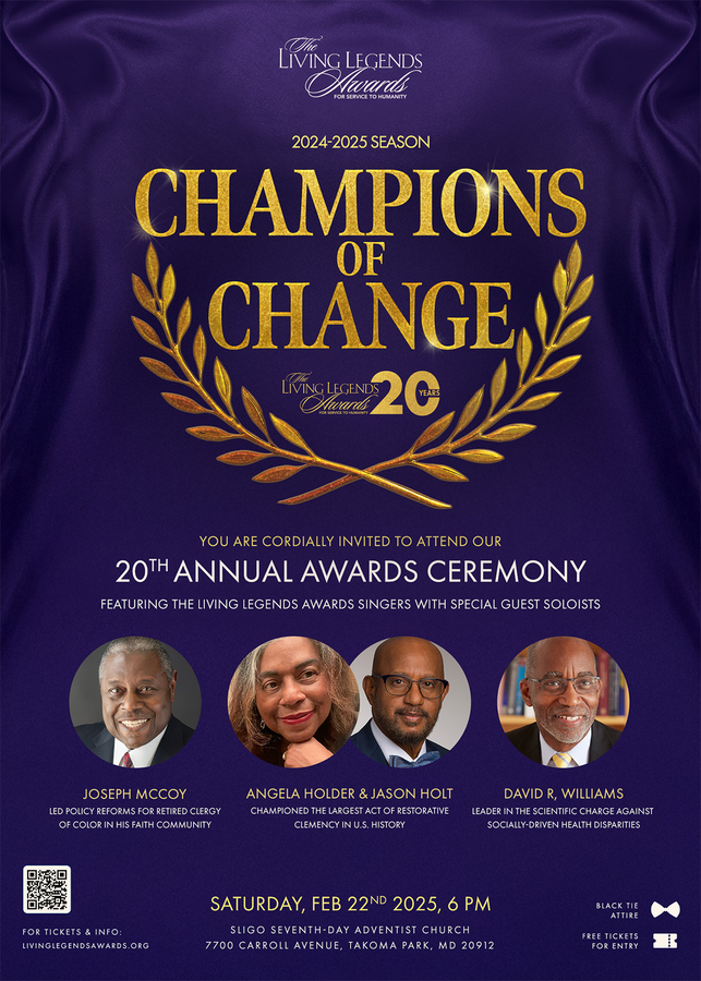 SILVER SPRING, MD, February 07, 2025 /24-7PressRelease/ -- Come join us at the Sligo Seventh-day Adventist Church for the 20th Annual Living Legends Awards for Service to Humanity, a special event honoring individuals who have made a significant impact on the community through their service. This in-person celebration will take place on Saturday, February 22, from 6 PM to 9 PM EST at 7700 Carroll Ave, Takoma Park, MD 20912. The theme this year is Champions of Change.