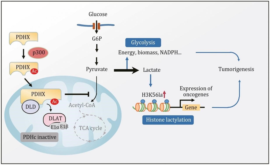 The study demonstrates that PDHX, a key component of the PDC, undergoes acetylation at lysine 488 by the acetyltransferase p300. This modification impedes the interaction between PDHX and dihydrolipoyl transacetylase (DLAT), disrupting PDC core assembly and reducing its activity. As a result, glucose metabolism is rerouted towards aerobic glycolysis, boosting lactate production. The elevated lactate levels then induce histone lactylation, especially at H3K56, triggering oncogene expression that drives tumor growth.