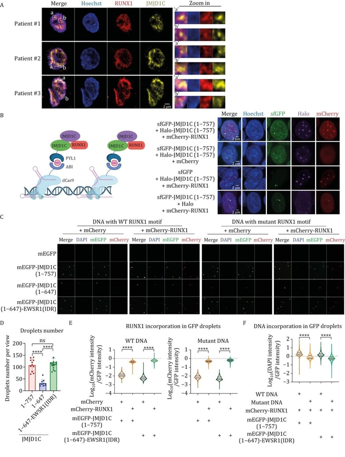 The research delves into how JMJD1C facilitates leukemia cell survival by forming liquid-like condensates through its intrinsically disordered N-terminal region. This unique feature enables JMJD1C to be recruited by RUNX1 to genomic loci, including super-enhancers (SEs). These interactions activate key genes responsible for AML cell proliferation and metabolic processes, maintaining the leukemic state. Importantly, the study highlights that JMJD1C's non-catalytic functions are critical, with its condensate-forming ability being essential for RUNX1 recruitment and gene regulation. Key experiments revealed that disrupting JMJD1C's N-terminal region impairs its ability to form condensates and interact with RUNX1, leading to reduced leukemia cell viability. Moreover, JMJD1C's RUNX1-containing condensates might mediate enhancer-promoter interactions crucial for the expression of key leukemic genes regulated by RUNX1. These findings underscore the therapeutic potential of targeting the JMJD1C-RUNX1 axis to halt leukemia progression.