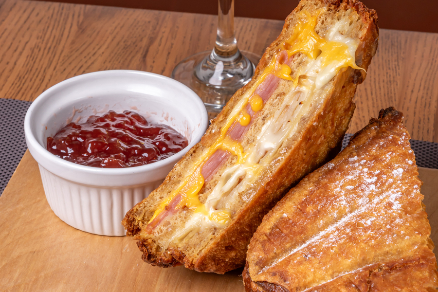 Monte Cristo – A deep-fried classic with turkey, ham, Swiss, and American cheese, dusted with powdered sugar and served with strawberry jam.