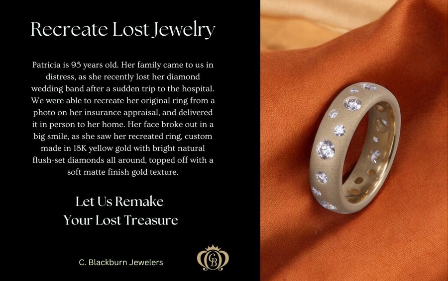 With decades of experience as a trusted local jeweler, C. Blackburn Jewelers offers a neighborly approach backed by professional skill. Clients enjoy one-on-one consultations, meticulous attention to detail, and the choice to either faithfully replicate a lost piece or elevate it with modern flair. The result? Jewelry that not only restores what's lost but often marks a fresh start.