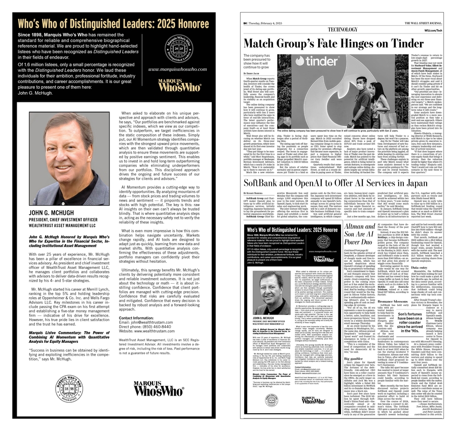 DESTIN, FL, March 27, 2025 /24-7PressRelease/ -- John G. McHugh, president and chief investment officer of WealthTrust Asset Management LLC, was selected by Marquis Who's Who for a prominent feature in the Florida Edition of The Wall Street Journal, published on February 4, 2025.