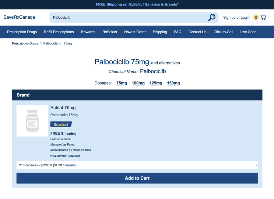 VANCOUVER, BC, April 14, 2025 /24-7PressRelease/ -- SaveRxCanada.to, a reliable online pharmacy serving patients across North America for over 20 years, is now making it easier and more affordable for breast cancer patients to access the life-extending medication Palbociclib (brand name: Ibrance). Through licensed suppliers in India, patients can now purchase the generic version, Palnat, for just $4.38 USD per capsule—a dramatic savings compared to U.S. pharmacy prices.