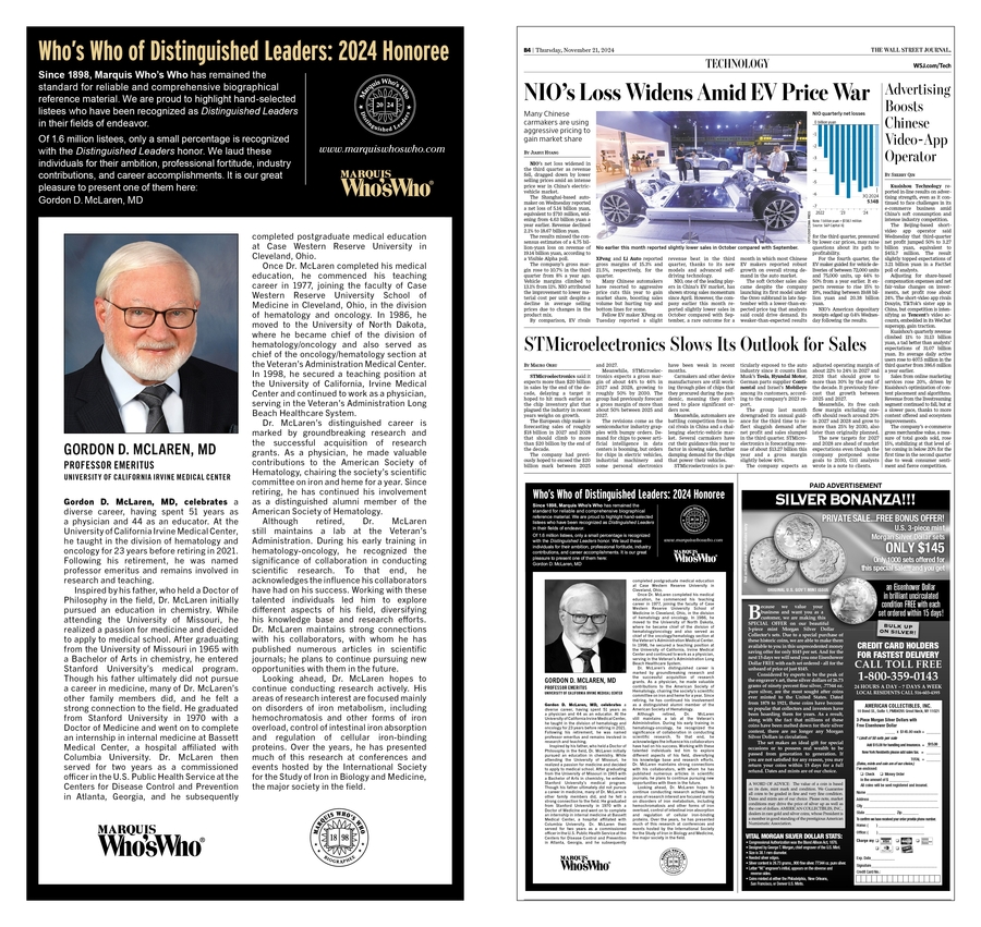 IRVINE, CA, May 02, 2025 /24-7PressRelease/ -- Gordon D. McLaren, MD, professor emeritus of the University of California Irvine Medical Center, was selected by Marquis Who's Who for a prominent feature in the Southern California Edition of The Wall Street Journal, published on November 21, 2024.
