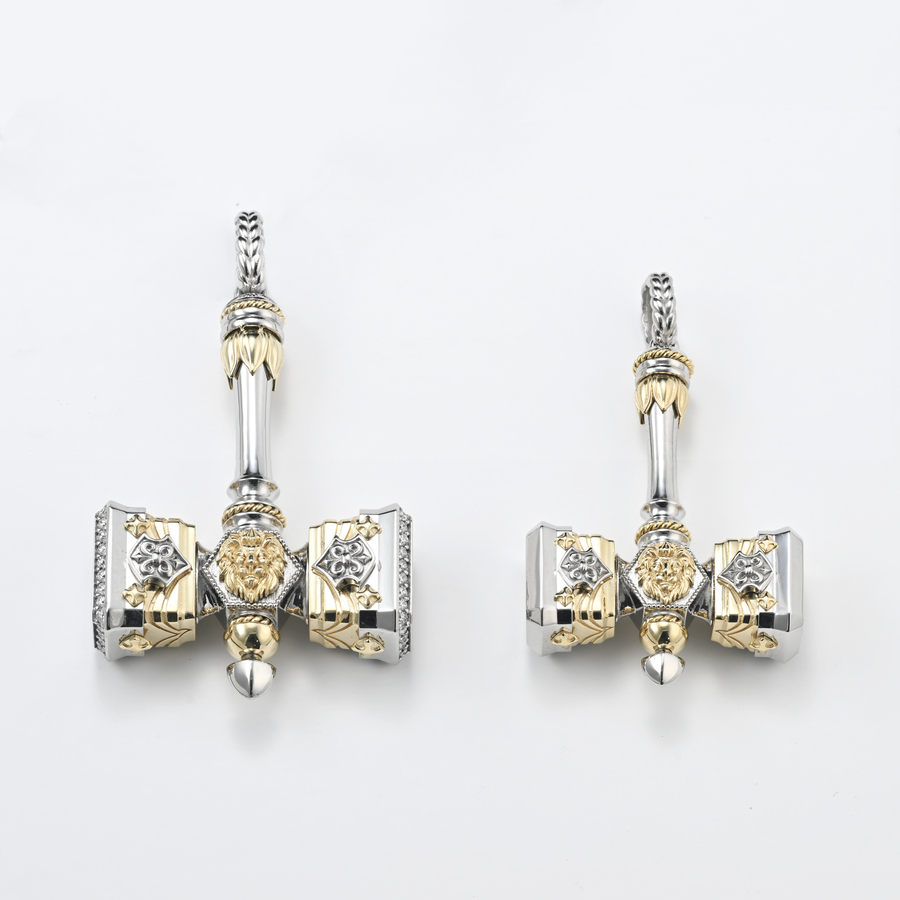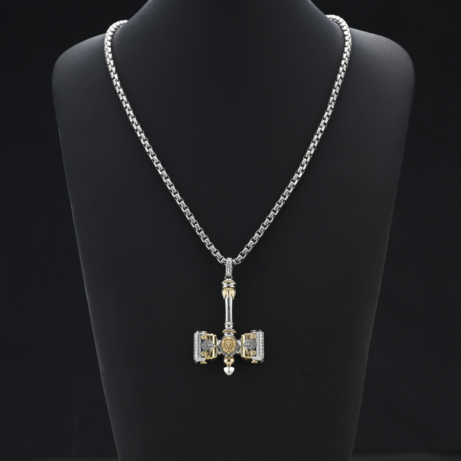 More than just an accessory, the hammer pendant is a tribute to timeless strength and legacy. Every contour and detail is shaped by hand, showcasing the mastery of traditional jewelry techniques. The contrast between the platinum body and the gold accents creates a distinctive visual impact — powerful, elegant, and unmistakably refined.