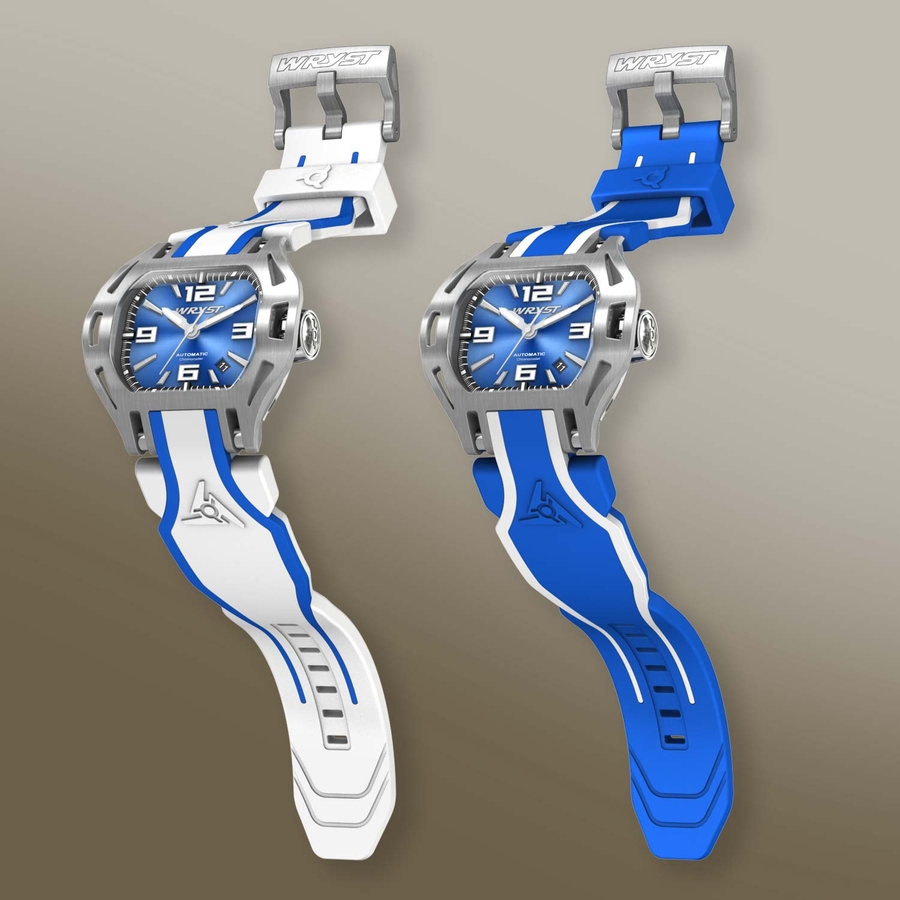Wryst refreshes its collection of blue watches with this new iteration, featuring an eye-catching 'white and blue' dual-injection silicone strap. For added versatility, the watch also includes a deep blue strap accented with two white stripes, allowing the wearer to adapt the timepiece to various moods and occasions. This bold timekeeper offers adaptability to suit any situation.