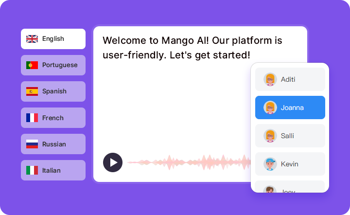 Users can personalize their pet's speech by uploading a voice recording or a written script. For scripts, Mango AI offers a diverse library of AI-generated voices, varying in age, gender, accent, and tone. Whether using a custom recording or an AI voice, the tool recognizes the text of the written script and the vocals of the audio file to deliver realistic lip synchronization in the resulting talking animal video.