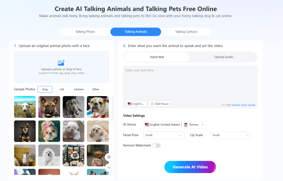 Mango AI has trained its tool to support multiple animals in creating pet videos. The tool works with domestic animals, like cats and dogs, and even wild animals. This feature increases the versatility of the platform, allowing users to make any pet or animal talk like a human. It only requires a clear photo of the animal, and the advanced AI model handles the rest to deliver professional-quality animations with ease.