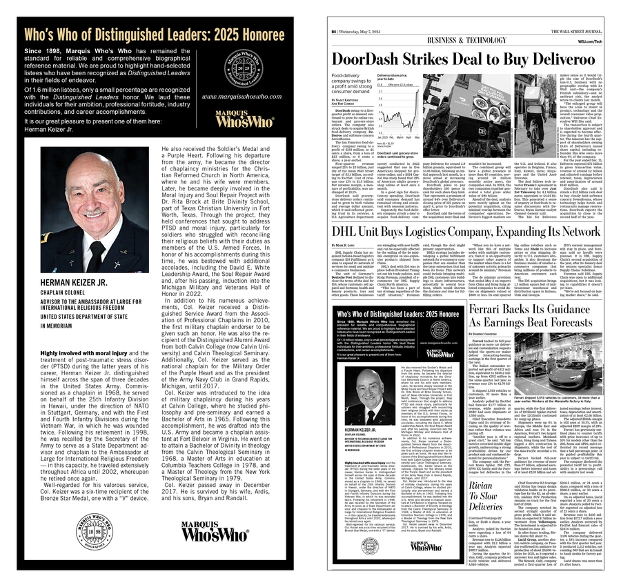 CALEDONIA, MI, June 02, 2025 /24-7PressRelease/ -- Herman Keizer Jr., former chaplain colonel and advisor to the Ambassador at Large for the International Religious Freedom of the United States Department of State, was selected by Marquis Who's Who for a posthumous feature in the Washington/Baltimore Edition of The Wall Street Journal, published on May 7, 2025.