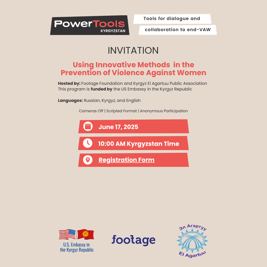 BISHKEK, KYRGYZ REPUBLIC, June 13, 2025 /24-7PressRelease/ -- Footage Foundation and El Argatuu will host a webinar to discuss needs assessment research findings and Footage's innovative methods, on Tuesday, June 17, 2025, at 10:00 AM Bishkek time. This is the first of three events in their collaborative program. The event, a live webinar titled "Using Innovative Methods in the Prevention of Violence Against Women," will showcase the power of storytelling, compassion, and participatory methods in violence prevention and offer insights into how voice-centered, trauma-informed approaches can foster trust, shift harmful norms, and strengthen support systems.