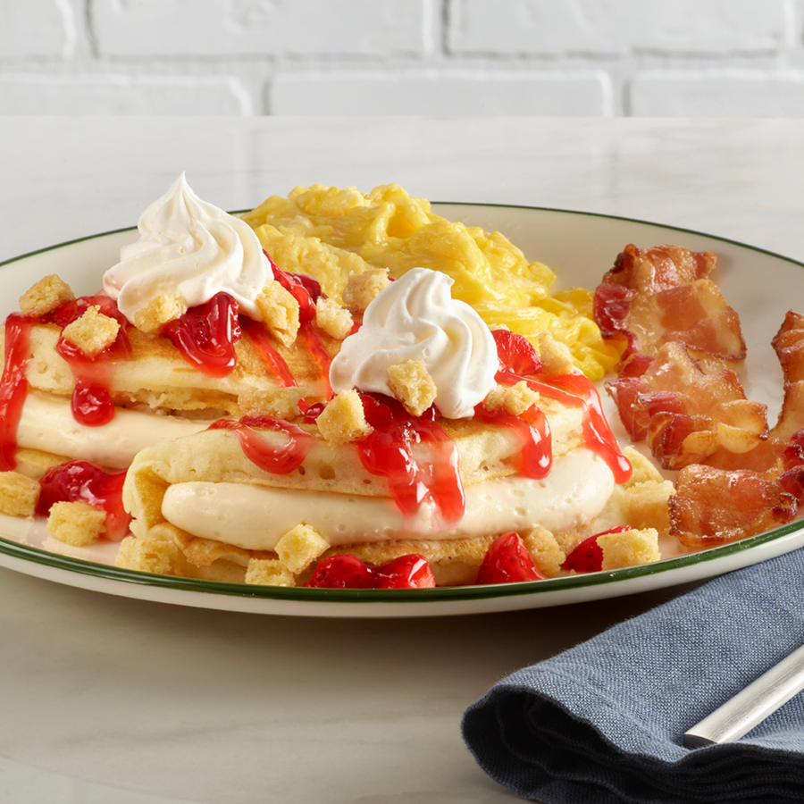 Strawberry Cheesecake: Two buttermilk pancakes layered with a creamy cheesecake filling, topped with glazed strawberries, Perkins exclusive sugar cookie streusel and whipped topping. Served with two eggs* and choice of two applewood smoked bacon strips or two sausage links.