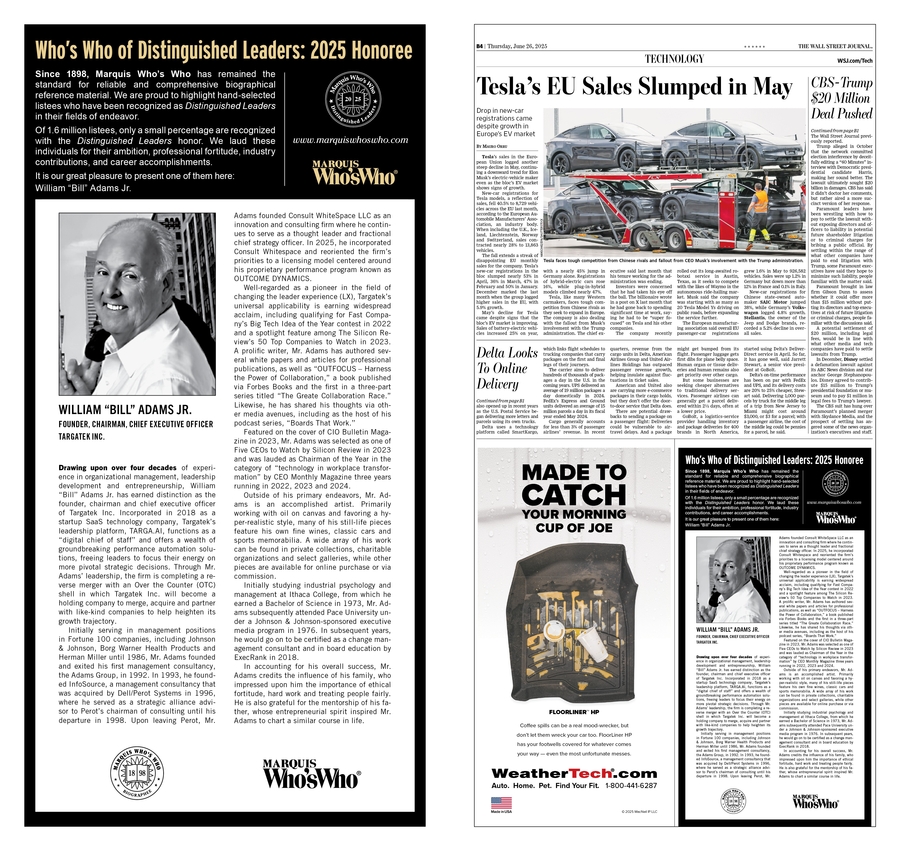 SAINT AUGUSTINE, FL, June 30, 2025 /24-7PressRelease/ -- William "Bill" Adams Jr., founder, chairman and chief executive officer of Targatek Inc., was selected by Marquis Who's Who for a prominent feature in the Florida Edition of The Wall Street Journal, published on June 26, 2025.