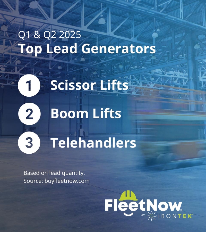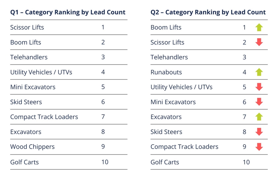 Boom lifts, scissor lifts, and telehandlers maintained the top three spots by lead count. However, demand for compact machines surged. Runabouts entered the top 10 with more than double the inquiries.