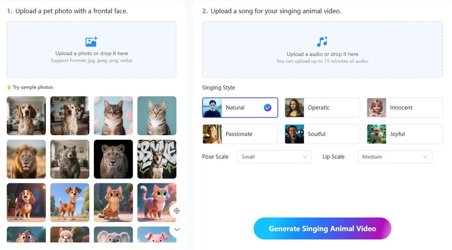 An outstanding feature of the tool is the variety of singing styles available, including natural, operatic, innocent, passionate, soulful, and joyful. These styles help give each pet a unique character, mood, and personality. Additionally, pose scale and lip scale controls empower users to adjust body movement and mouth animation, enabling fine-tuning of the animation to match different moods and creative goals.
